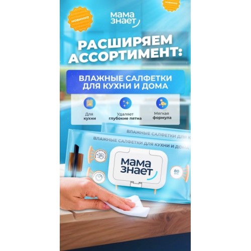 Влажные салфетки для кухни и дома Мама Знает - это новый и удобный способ удаления жира и пятен одним движением. Салфетки подходят для очистки кухонных принадлежностей, стола, стульев, стекла и т. д. Эффективное удаление жира и пятен. Очистка и дезинфекция в каждой салфетке. Область применения: подходит для бытовых кухонных плит, обеденных столов, вытяжек, шкафов, раковин и других поверхностей.