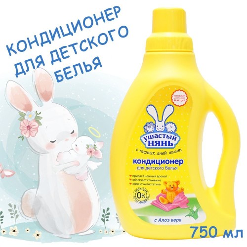 Кондиционер (антистатик) для белья Ушастый Нянь 750 мл. подходит для стирки детского белья, с первых дней жизни. Удобно дозируется с помощью колпачка-мерника. Не вызывает аллергических реакций - доказано ФГУ «РНИИТО Росмедтехнологий». Содержит экстракт Алоэ-вера, обладает смягчающими, увлажняющими и успокаивающими кожу свойствами.