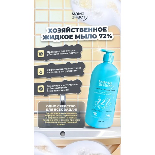 Жидкое хозяйственное мыло Мама знает 72% подходит для уборки, стирки и мытья посуды.