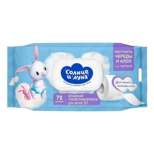 Солнце и Луна Детская Влажная Туалетная Бумага с Экстрактом Череды, Алоэ и Д-пантенолом 72шт 0+